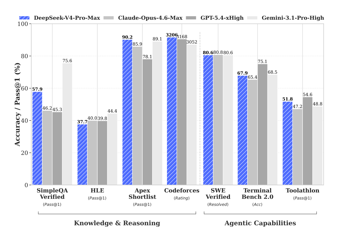 In a 1-million-token context scenario, DeepSeek-V4-Pro requires only 27 percent of the computational power and 10 percent of the KV cache, the short-term memory AI models use, compared to DeepSeek-V3.2. More critically, every benchmark to check the new model’s capabilities and knowledge put it at or above the state-of-the-art. Admittedly, Claude Opus 4.7 was not included, and neither was the just released GPT-5.5 for obvious reasons. Nevertheless, only Gemini 3.1 Pro at high reasoning settings comprehensively beats DeepSeek V4 in one benchmark (SimpleQA Verified).
