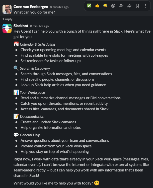 What we do find positive is that Slack has chosen to improve Slackbot in small steps. What we mean by that is that they don’t say, “We have developed Slackbot as a personal assistant that can help you with everything.” Instead, they clearly communicate how it has been trained, what Slackbot can and cannot do, and what they are working towards. This makes it clear to users what is and is not possible. The actions that Slackbot can perform work well, which is extremely important for user confidence. You can also simply ask Slackbot itself, “What can you do for me?”