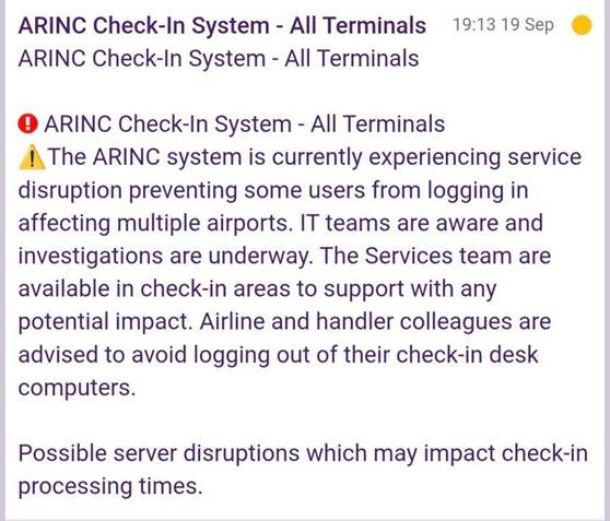 - A ransomware attack targeting the ARINC vMUSE systems at Collin’s Aerospace caused widespread airport check-in disruptions.